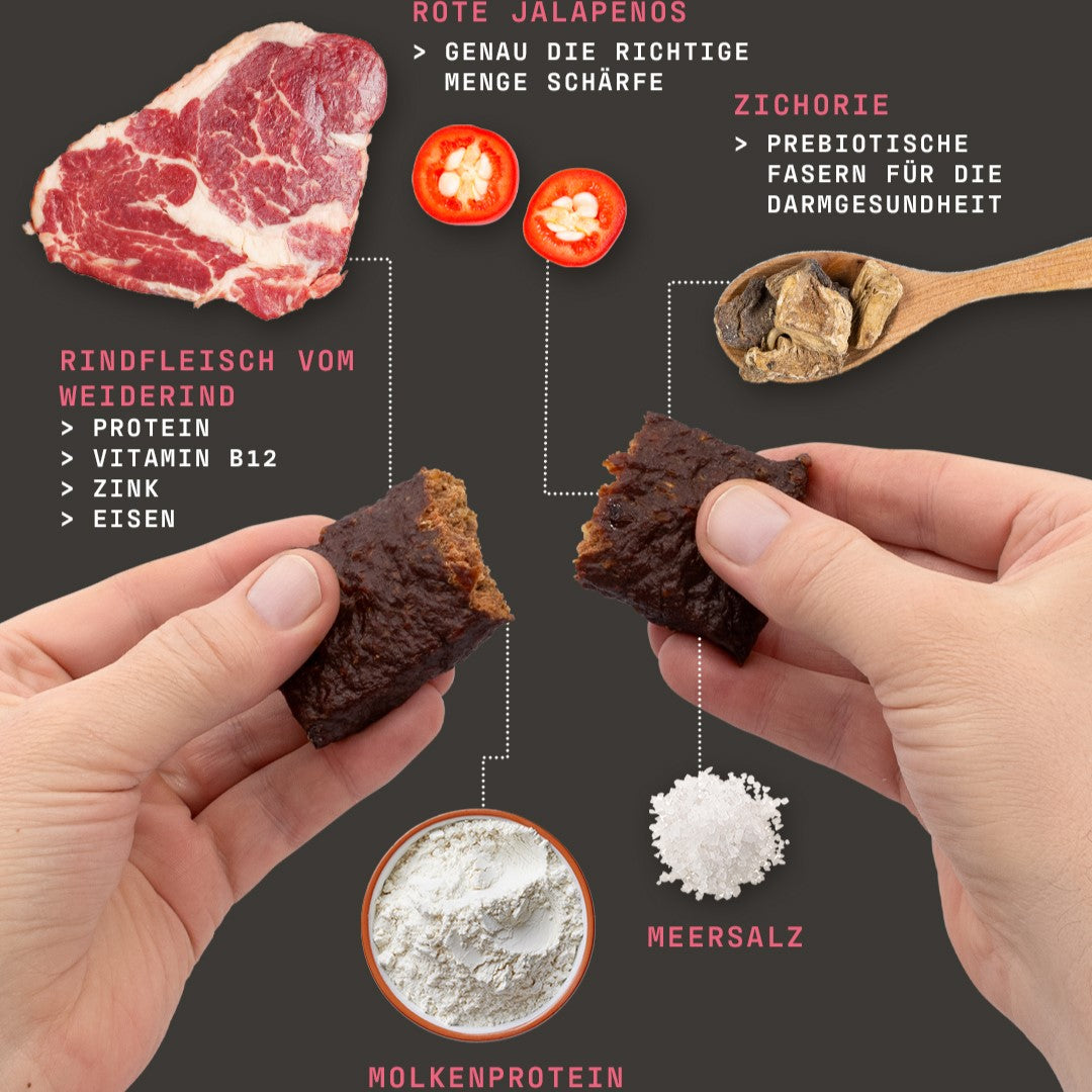 Riegel aus Weiderindfleisch mit Jalapeño-Chili-Geschmack. Keine Konservierungsstoffe und nur 6 natürliche Zutaten mit mehr Protein pro Kalorie als jeder andere Riegel. Echtes Protein überall und jederzeit