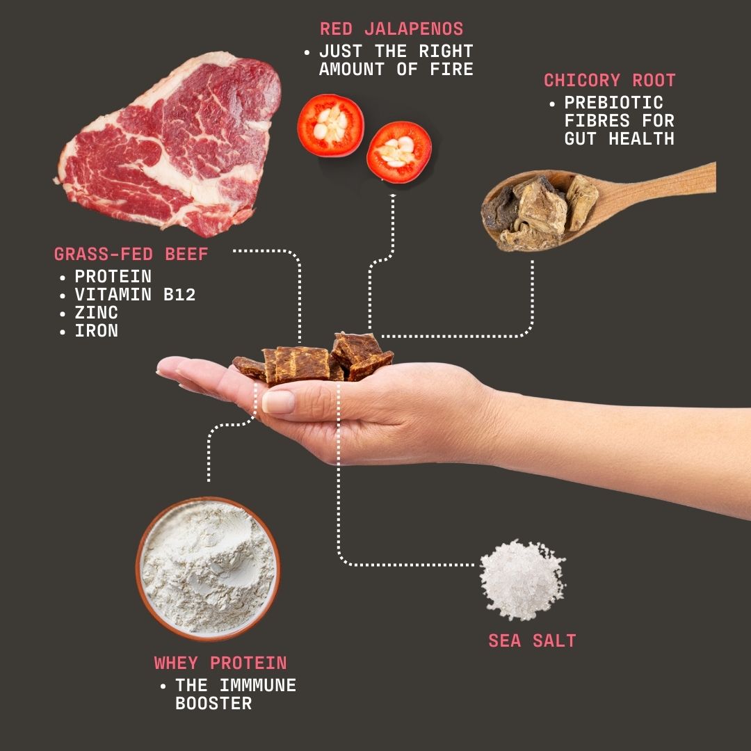 Jalapéno Chilli Grass-Fed Beef Bites. Zero preservatives used for unrivalled real protein anywhere, anytime