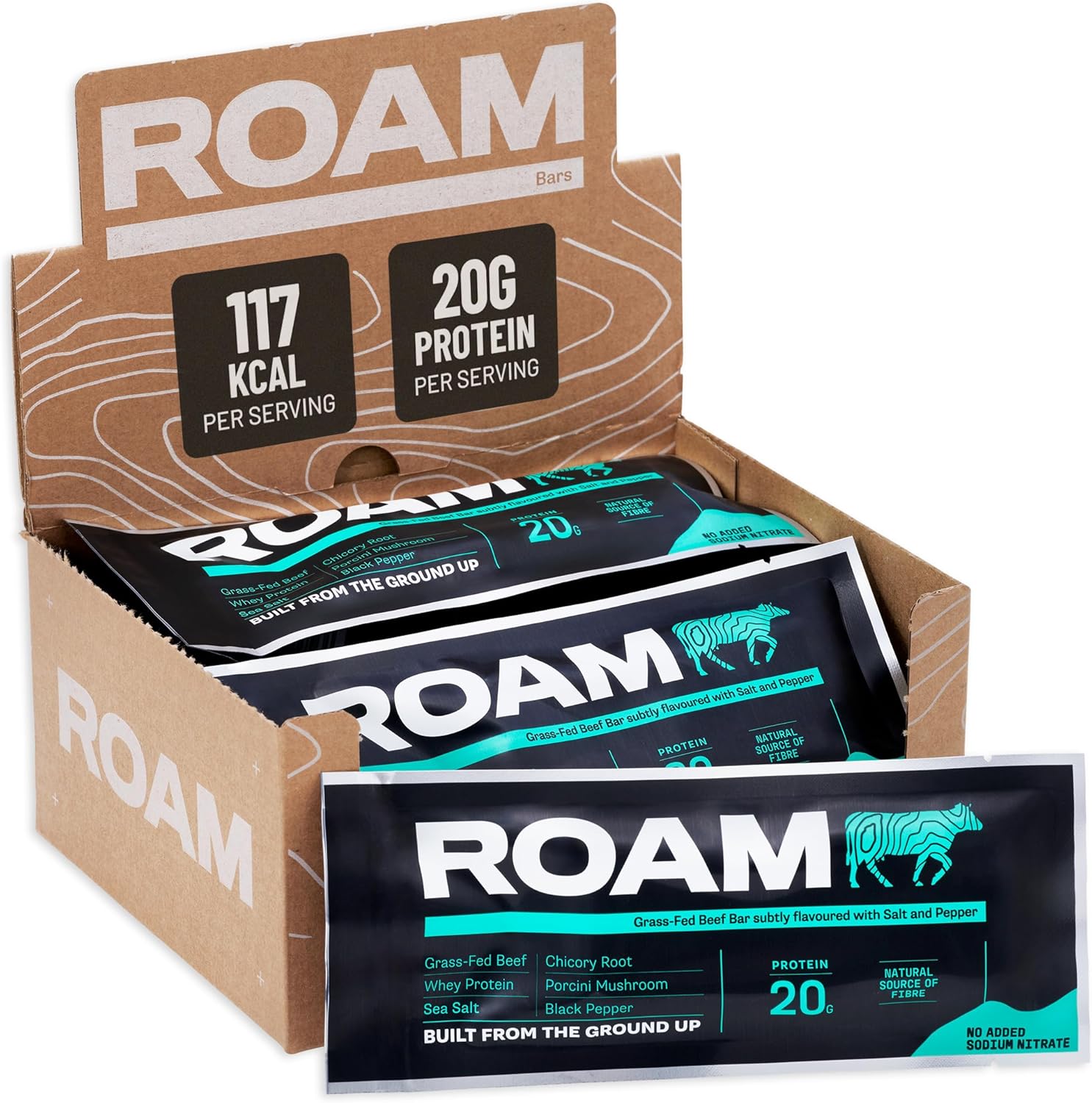 Grass-fed beef bar flavoured with sea-salt, pepper & porcini mushroom. Zero preservatives & more protein per calorie than any bar. Real protein anywhere, anytime